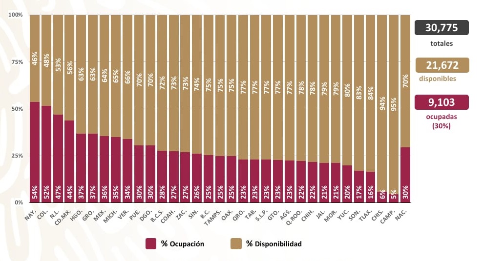 De 30 mil 775 camas, hay 21 mil 672 disponibles y 9 mil 103 están ocupadas. Los estados con mayor ocupación hospitalaria para camas de atención general son: Nayarit, Colima y Nuevo León.