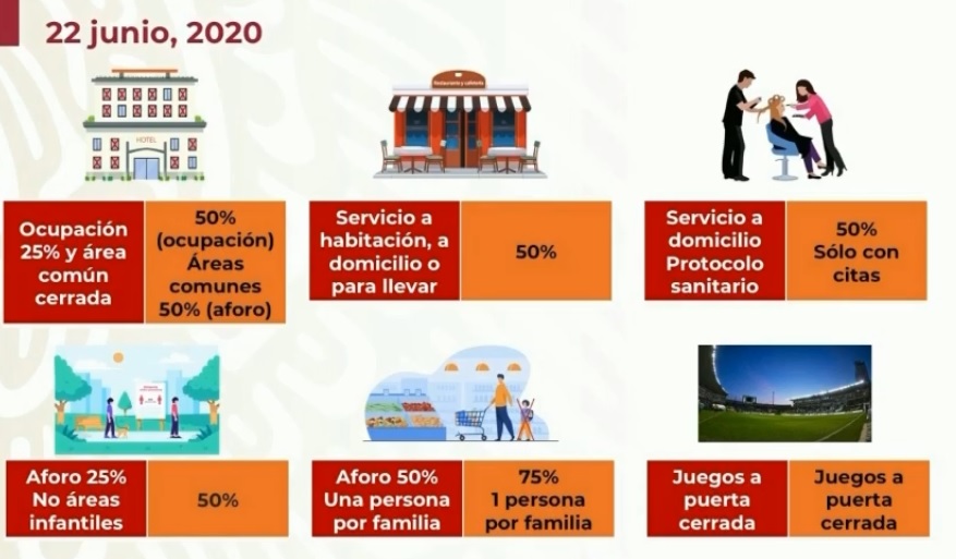 El Director General de Epidemiología, reiteró las actividades que están permitidas durante el semáforo en color naranja y su aforo, tales como: la ocupación hotelera al 50 por ciento al igual que sus áreas comunes, los parques, del mismo modo, con el 50 por ciento de su aforo total y la entrada a los supermercados continuará siendo de una persona por familia con un aforo máximo del 75 por ciento.