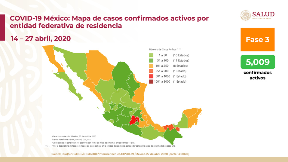 La Secretaría de Salud informó este lunes 27 de abril que en México han muerto mil 434 personas por el coronavirus y que actualmente se tiene registro de 15 mil 529 casos confirmados.