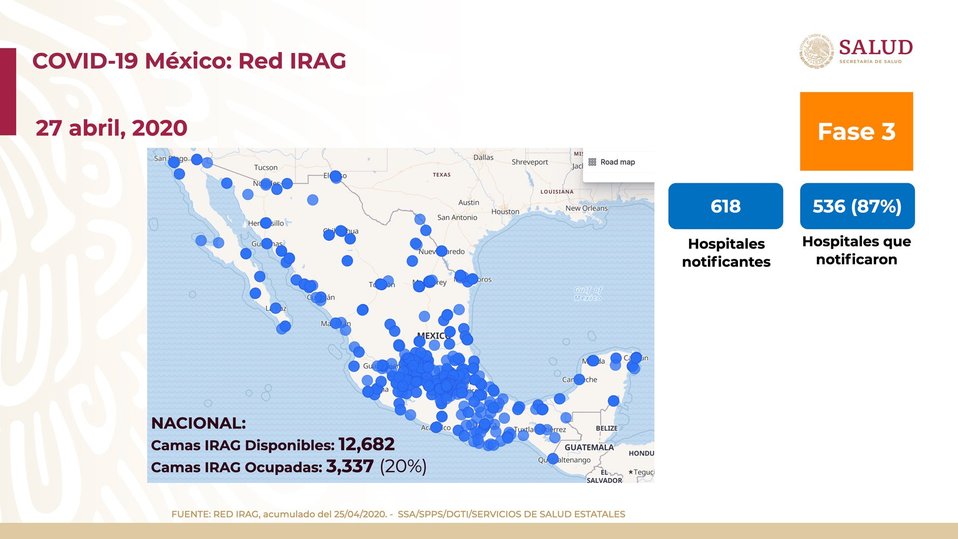 En cuanto a la Red IRAG, la cifra de camas disponibles es 12 mil 682 y 3 mil 337 están ocupadas. En cuanto a los 15 mil 529 casos confirmados de covid-19, el 42 por ciento son mujeres y el 58 por ciento son hombres con una media de edad de 46 años.