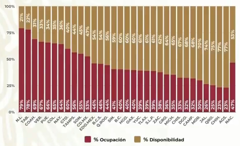 De 30 mil 199 camas para atención general, hay 16 mil 076 disponibles y 14 mil 123 están ocupadas. Los estados que presentan mayor ocupación de estas camas son: Nuevo león, Tabasco y Coahuila.