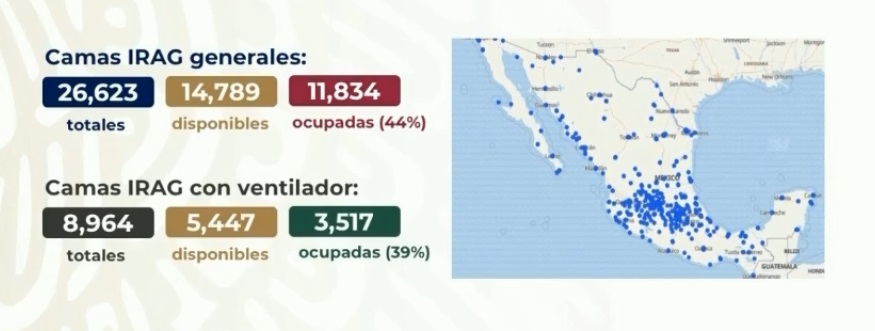 En cuanto a las camas para atender a pacientes con coronavirus, de 26 mil 623 hay 14 mil 789 disponibles y 11 mil 834 están ocupadas.