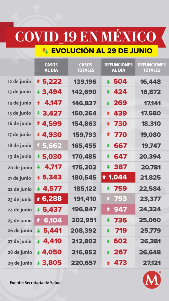 La Secretaría de Salud informó este lunes que en México han fallecido 27 mil 121 personas por coronavirus y se tiene registro de 220 mil 657 casos.
