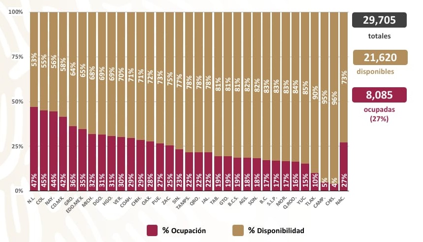 De 29 mil 705 camas, hay 21 mil 620 disponibles y 8 mil 085 están ocupadas. Los estados con mayor ocupación hospitalaria para camas de atención general son: Nuevo León y Colima.