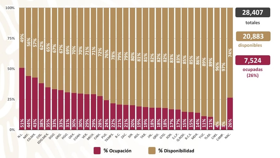 De 28 mil 407 camas, hay 20 mil 883 disponibles y 7 mil 524 están ocupadas. Los estados con mayor ocupación hospitalaria para camas de atención general son: Nuevo León, Nayarit y la CdMx.