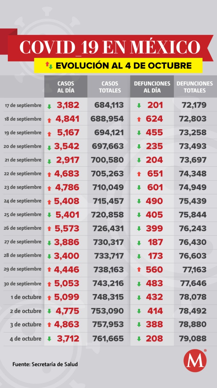 México suma 79 mil 088 muertes por coronavirus SARS-CoV-2 y registra 761 mil 665 casos confirmados acumulados, de acuerdo con el último reporte de la Secretaría de Salud dado a conocer por Ricardo Cortés Alcalá, titular de la Dirección General de Promoción de la Salud.