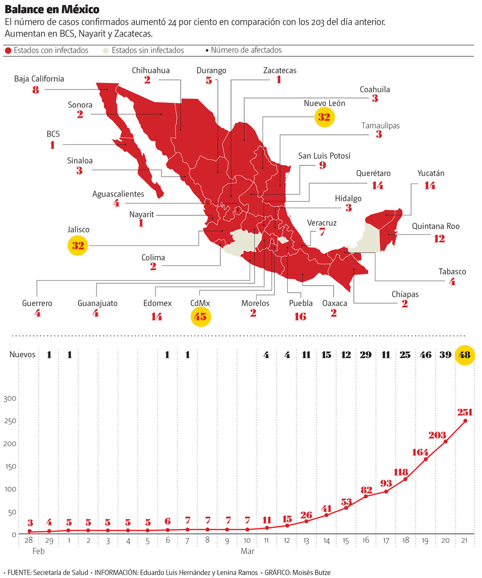 En México, la pandemia por coronavirus Covid-19 ha dejado dos personas muertas y 251 el número de casos confirmados en el país, informó ayer en su último corte la Secretaría de Salud.