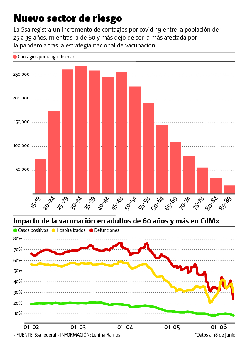 La población de 30 a 34 años se convirtió en el sector con más contagios activos y hospitalizaciones porcovid-19, en contraste con las personas de la tercera edad, población que ya fue vacunada en su mayoría.