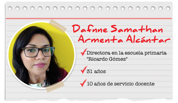 Trasladar al espacio virtual la educación de los niños ha significado un doble reto para Dafnne Samathan Armenta Alcántara, directora en la escuela primaria Ricardo Gómez, ya que ahora deben buscar que las actividades sean adecuadas para que los padres puedan desarrollarlas junto con los estudiantes.