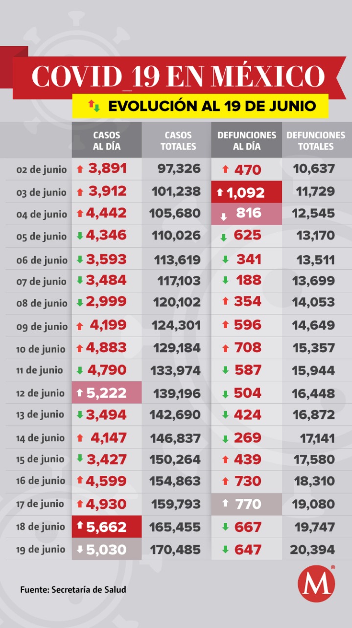 La Secretaría de Salud informó que en México, al 19 de junio se reportan 20 mil 394 muertes y 170 mil 485 casos acumulados, de los cuales 23 mil 653 son activos, además hay casos 62 mil 245 clasificados como sospechosos, informó José Luis Alomía, director general de Epidemiología.