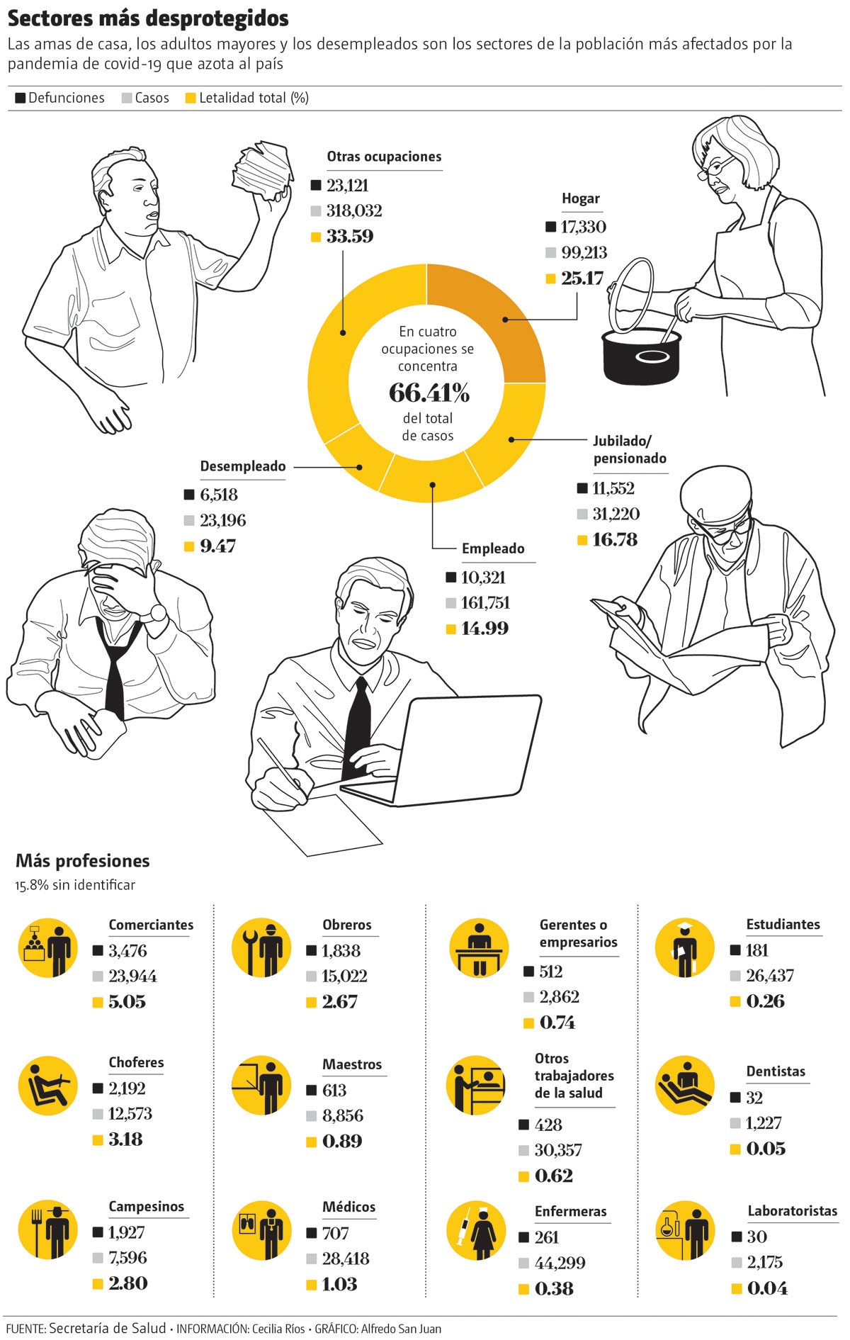 Así, amas de casa (con 25.1% de las muertes por covid); jubilados y pensionados (con 16.8%), y desempleados (con 9.4%) concentran 51.3% de las muertes totales por coronavirus en el país.