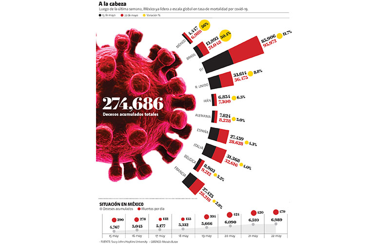 En la última semana las muertes por covid-19 en México aumentaron 56.1 por ciento, el mayor crecimiento porcentual entre los 10 países con más decesos en el mundo, tras pasar de 4 mil 477 a 6 mil 989 casos, de acuerdo con los datos de la Secretaría de Salud.