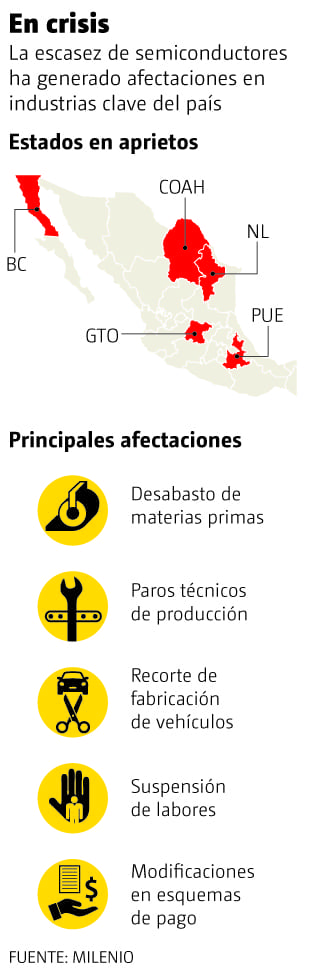 La escasez mundial de semiconductores tiene en jaque a los sectores electrónico y, principalmente, automotriz en Nuevo León, Puebla, Coahuila, Baja California y Guanajuato obligando a algunos fabricantes a implementar paros técnicos, suspender líneas de producción de manera escalonada e incluso recortar la fabricación de modelos de vehículos.
