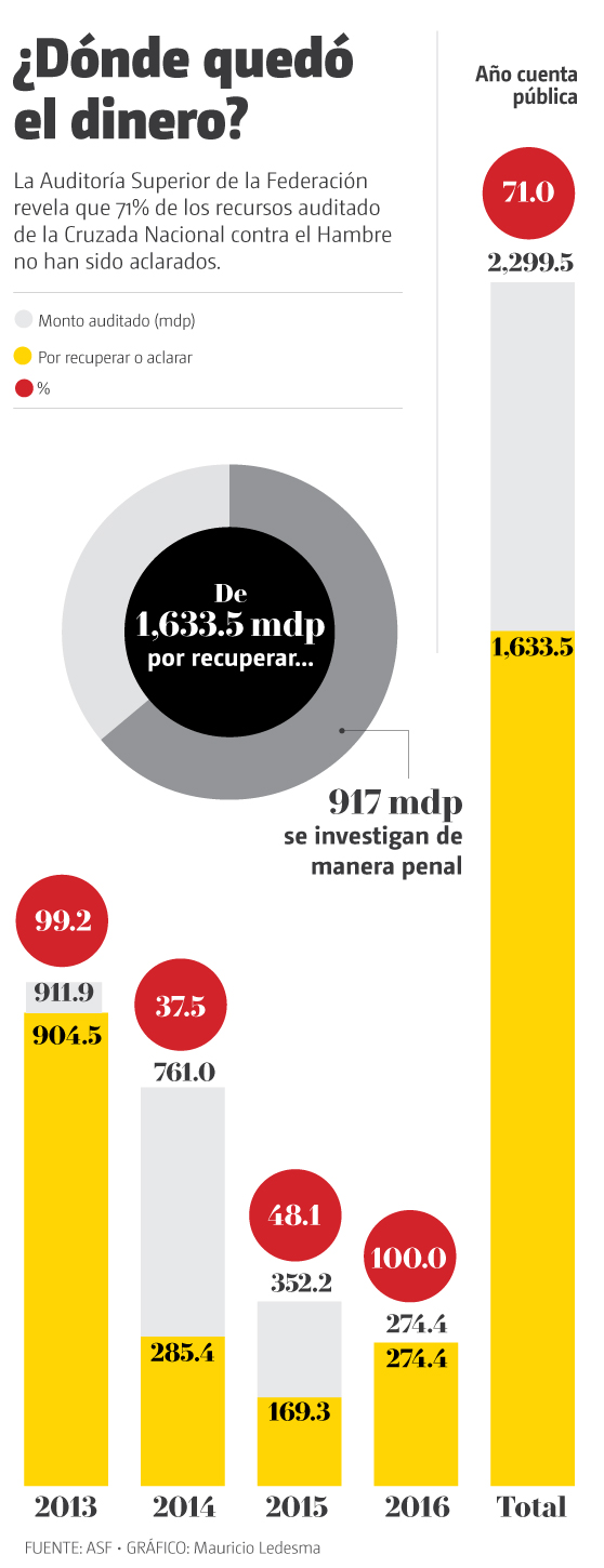 La Auditoría Superior de la Federación (ASF) detectó que, de 2013 a 2016, dependencias involucradas en la estrategia no han aclarado o devuelto los recursos que debieron utilizar para la estrategia contra la pobreza.