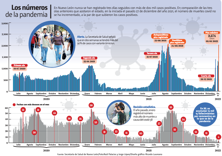 La Secretaría de Salud en Nuevo León informó que el 5 de enero cerró con 2 mil 574 casos positivos a covid-19, la cifra más alta en la entidad durante los 666 días de presencia activa del SARS-CoV-2 en el estado.