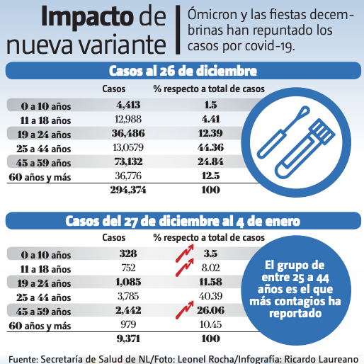 Y del 11 de marzo del 2020 al 26 de diciembre del 2021, este rango de edad tenía un acumulado de 73 mil 132 casos, de un total de 294 mil 374, lo que equivale a 24.84 por ciento.