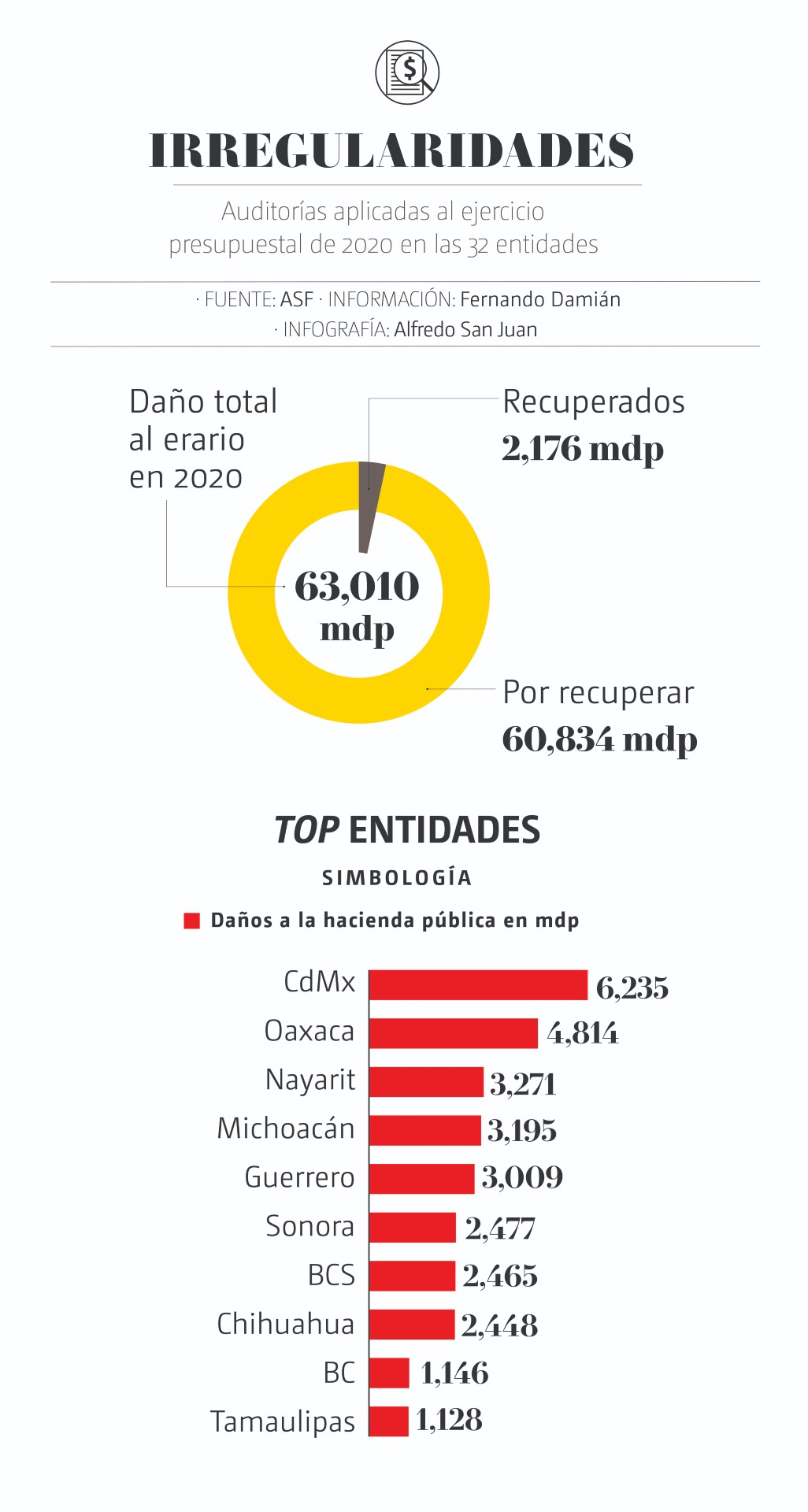 La Auditoría Superior de la Federación (ASF) documentó probables daños al erario por 63 mil 10 millones de pesos en la Cuenta Pública 2020, aunque 2 mil 176 millones se reportaron ya como recuperaciones operadas y quedan pendientes más de 60 mil 834 millones de pesos.