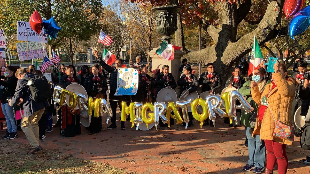 Con mariachis, globos y banderas, migrantes mexicanos y simpatizantes del presidente Andrés Manuel López Obrador se manifestaron en el Parque Lafayette para pedir al gobierno de Joe Biden una reforma migratoria que garantice su estancia legal en Estados Unidos.