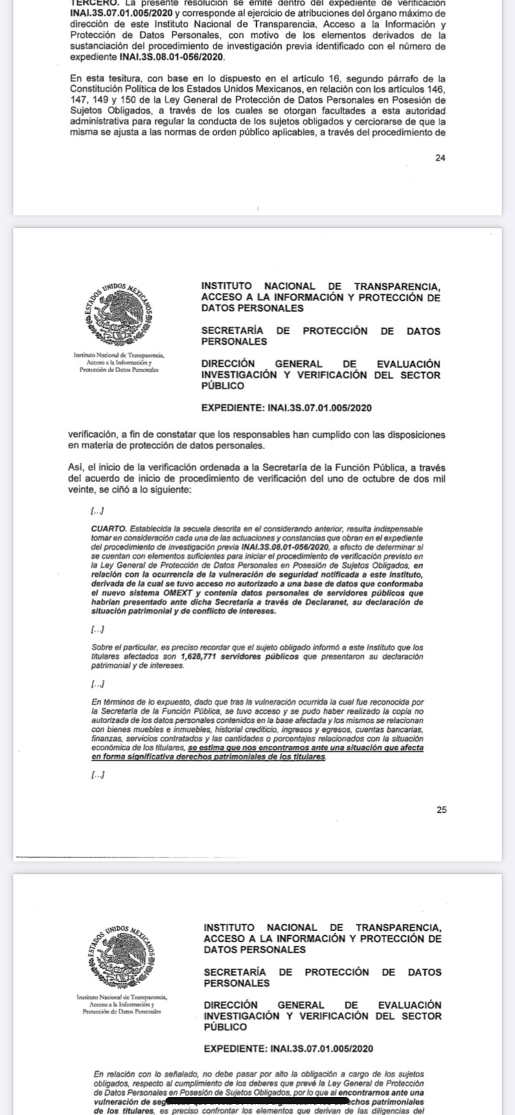 Con ello, la SFP violentó los deberes de confidencialidad y seguridad, así como a los principios de responsabilidad, información, consentimiento, licitud y lealtad que la dependencia debe cumplir al poseer, usar y resguardar datos personales de servidores públicos, determinó el INAI.
