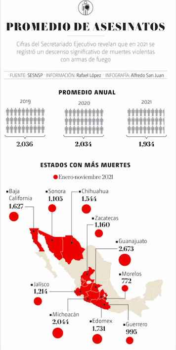 El SESNSP señala que los mayores índices de homicidios dolosos con arma de fuego se presentan principalmente en cinco estados que concentraron hasta noviembre de 2021 el 45.2 por ciento de las víctimas de asesinatos en el país: Guanajuato, Michoacán, Estado de México, Baja California y Chihuahua.