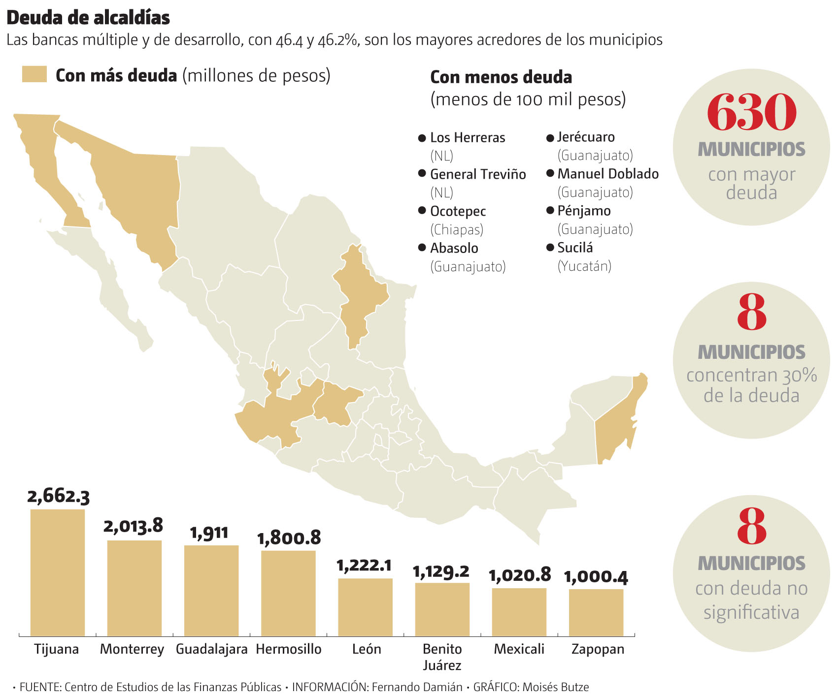 De acuerdo con el Centro de Estudios de las Finanzas Públicas de la Cámara de Diputados, tan solo ocho municipios concentran 30 por ciento del endeudamiento total, con un saldo superior a mil millones de pesos cada uno: Tijuana (2 mil 662 millones), Monterrey (2 mil 13 millones), Guadalajara (mil 911 millones), Hermosillo (mil 800 millones), León (mil 222 millones), Benito Juárez (Cancún) (mil 129 millones), Mexicali (mil 020 millones) y Zapopan (mil millones).
