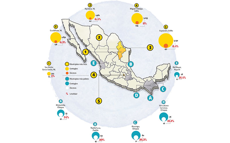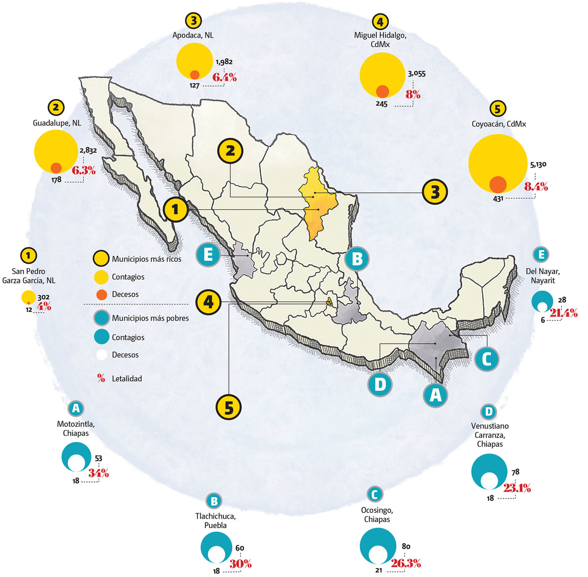 A escala nacional, el monitoreo del Consejo Nacional de Evaluación de la Política de Desarrollo Social (Coneval) detalla que en los 427 municipios más pobres, donde 80 por ciento de la población no puede comprar una canasta básica, muere 14.1 por ciento de los infectados, mientras que en las 54 alcaldías más prósperas, el nivel de letalidad disminuye a 8.1 por ciento.