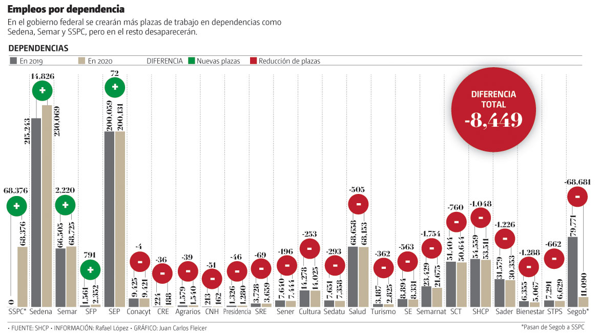 La propuesta entregada el pasado domingo revela que solo en las secretarías de la Defensa Nacional, Marina, Seguridad Pública Ciudadana y Función Pública se incrementará el número de plazas, mientras que en el resto de dependencias se reducirá la plantilla laboral.