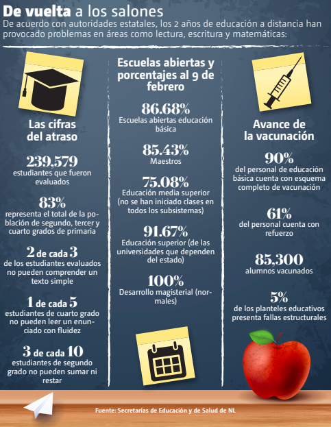 Por su parte, la secretaria de Educación en la entidad, Sofialeticia Morales Garza, precisó que este retorno seguro a las aulas se deriva, además del rezago educativo, a que se cuenta con la mayoría del personal vacunado contra la covid-19, a que las escuelas están listas, en 90 por ciento, y que según sus muestreos se tuvieron más casos positivos y sospechosos a covid-19 en la educación a distancia que en la presencial o mixta.