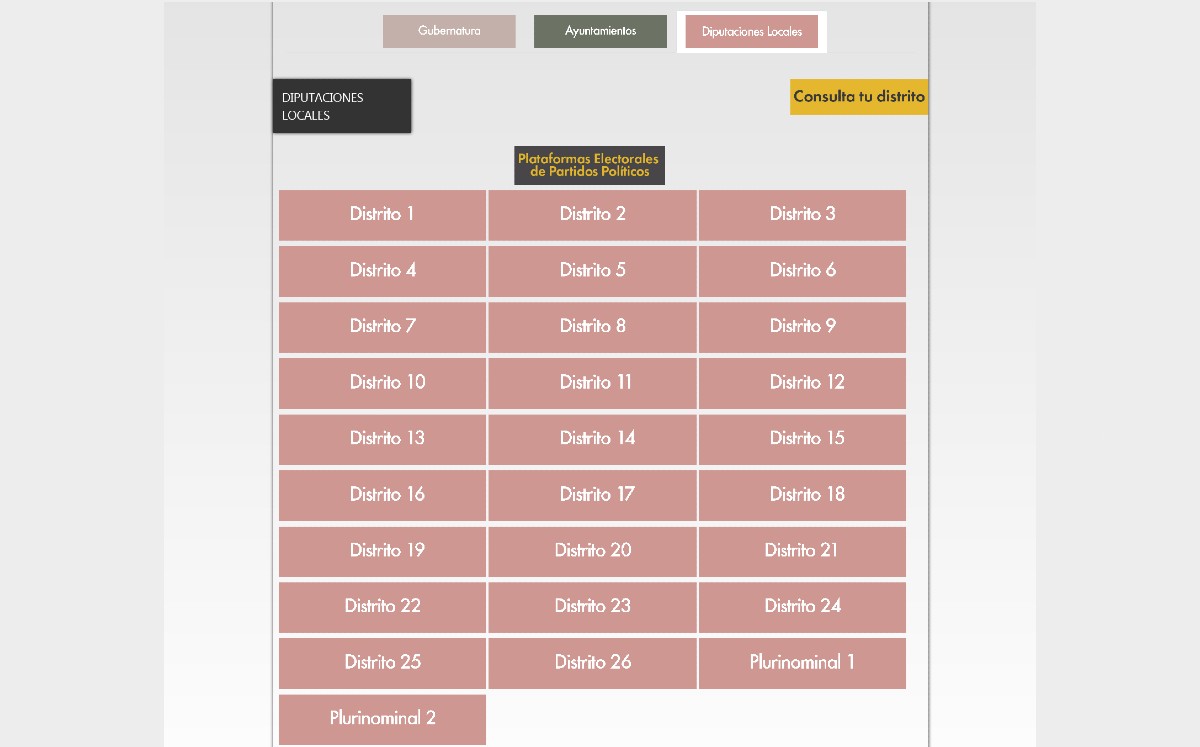De inicio entraremos a la plataforma voto informado y nos vamos a la sección de diputaciones locales que se encuentra a tu lado derecho, ahí aparecerán los 26 distritos.