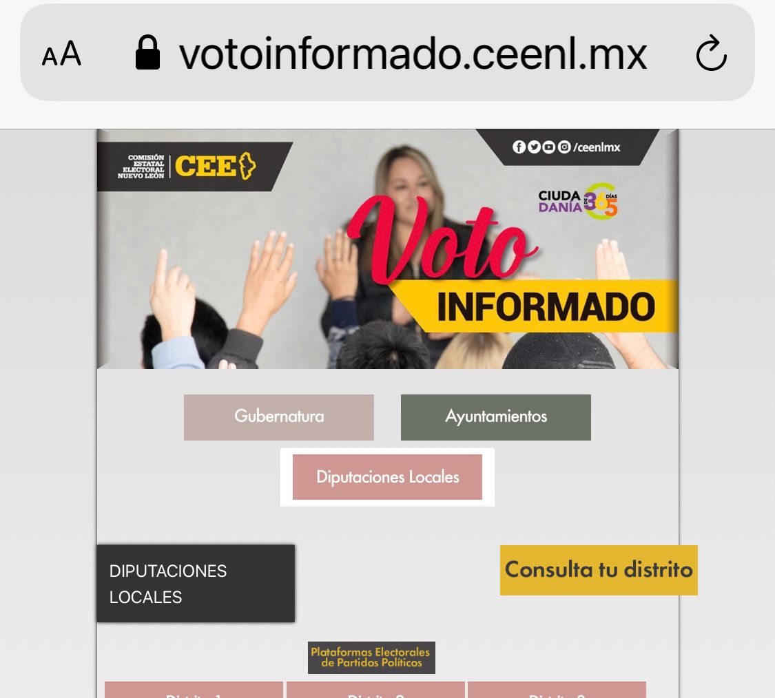 Para ello, la Comisión Estatal Electoral creó la página voto informado (https://votoinformado.ceenl.mx/index.aspx), en la cual podrás conocer a los candidatos a gobernador, alcaldes y diputaciones locales.