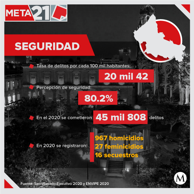 La inseguridad en la entidad va a la baja, según los datos de la Encuesta Nacional de Victimización y Percepción sobre Seguridad Pública (ENVIPE) 2020, pues la tasa de víctimas de delito por cada 100 mil habitantes es de 20 mil 42; en 2018 fue de 26 mil 25 y en 2017 de 23 mil 926. Sin embargo, el 68.9 por ciento de las personas encuestadas lo sigue considerando como el problema más preocupante en la entidad, por encima de la salud, por ejemplo.