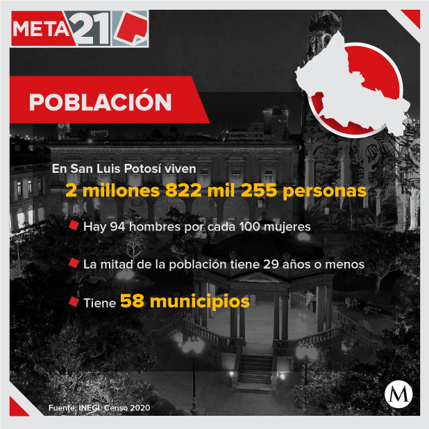 En el Censo 2020 del Instituto Nacional de Estadística y Geografía (Inegi) se contabilizaron 2 millones 822 mil 255 habitantes, lo que representa el 2.2 por ciento de la población nacional, con lo que San Luis Potosí se posiciona en el lugar 19 a nivel federal. Del total estatal, el 48.6 por ciento son hombres y el 51.4 por ciento mujeres. La edad mediana es de 29 años.