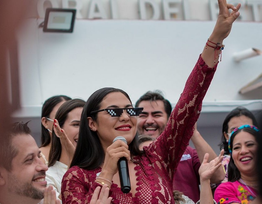 Afuera del Instituto Electoral del Estado de Colima (IEE), Indira Vizcaíno celebró con simpatizantes y se puso unos lentes pixeleados, como los del meme deal with it, que se usa para celebrar una hazaña y mandar el mensaje: "acéptalo y sigue adelante".