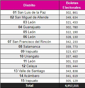 Un total de 4 millones 957 mil 511 boletas arribaron al estado de Guanajuato para las elecciones de Diputaciones Federales del próximo 6 de junio, así lo señaló Mario Barbosa Ortega, Vocal de Organización Electoral del INE en la entidad.