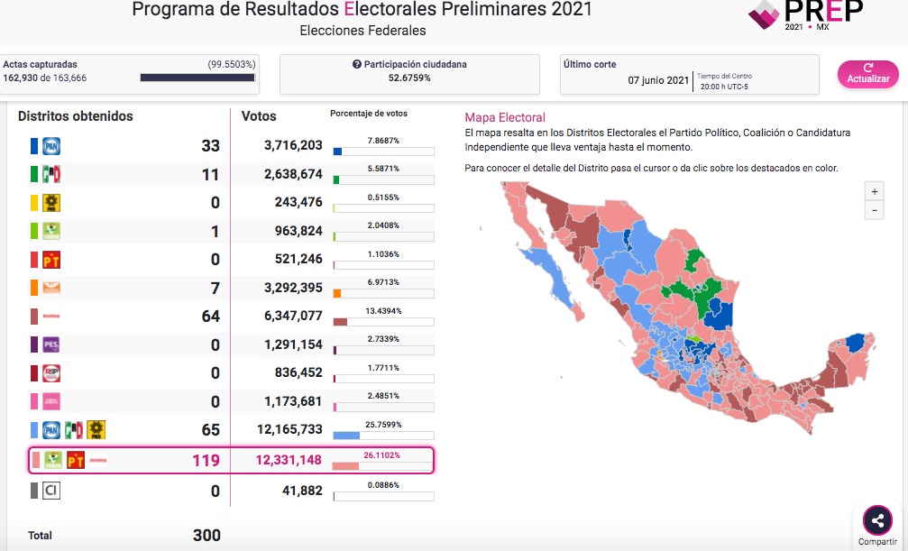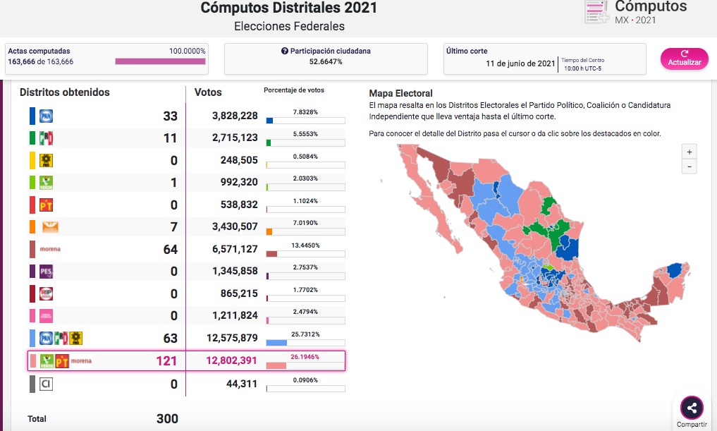 El lunes por la noche, al cerrar el PREP, Juntos Haremos Historia contaba con 119 distritos electorales ganados en las urnas y Va por México tenía 65. Esta mañana, tras concluir los cómputos distritales que iniciaron el miércoles el distrito 02 en Tantoyuca, Veracruz, y el distrito 01 en La Paz, Baja California, pasaron de la coalición Va por México a Juntos Hacemos Historia, con lo que los números quedan en 121 y 63 curules, respectivamente, a los que se sumarán las diputaciones plurinominales conforme al porcentaje de la votación.
