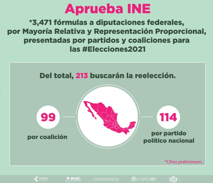 De acuerdo con el Instituto Nacional Electoral, de los 500 integrantes de la actual Legislatura, 213 buscan reelegirse: 99 por coalición y 114 por partido.