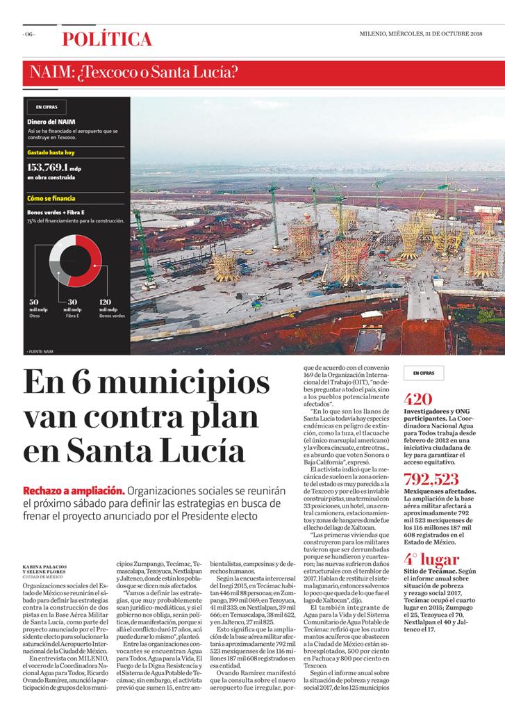 Destacaron que aunque “la contundente derrota del proyecto aeroportuario de Texcoco nos llena de alegría”, la lucha todavía no termina, por lo que no quitarán el dedo del renglón “hasta que (las constructoras) saquen todas las máquinas y su basura”.