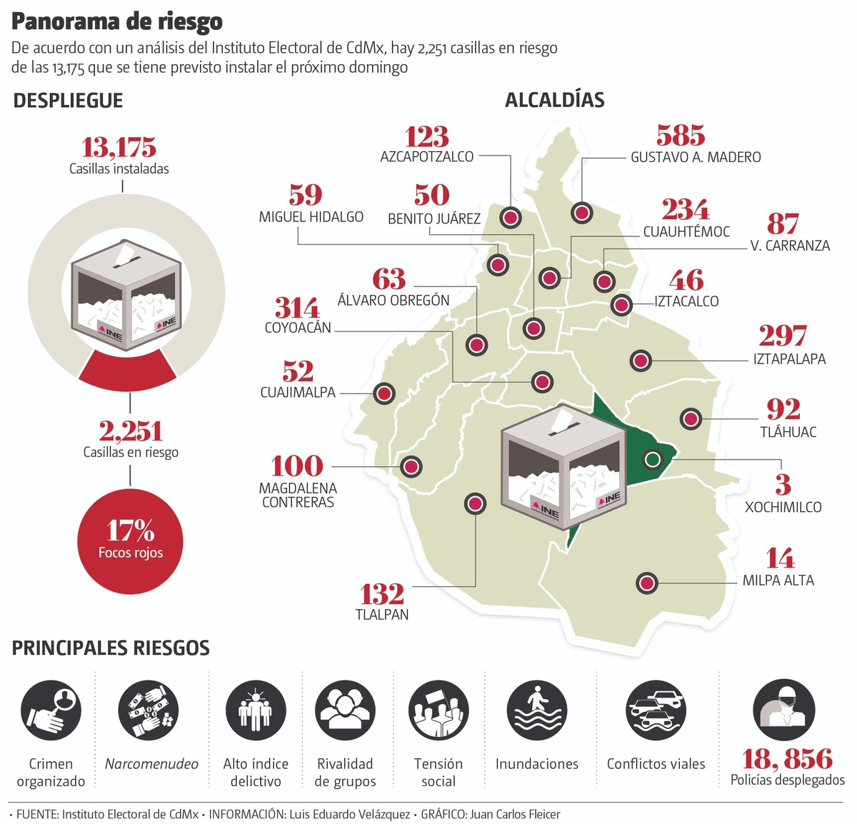 Hasta 17 por ciento de las casillas que se instalarán en CdMx este domingo para la elección de diputados federales, locales, alcaldes y concejos son focos rojos por contar con diversos riesgos, el más peligroso: el crimen organizado.
