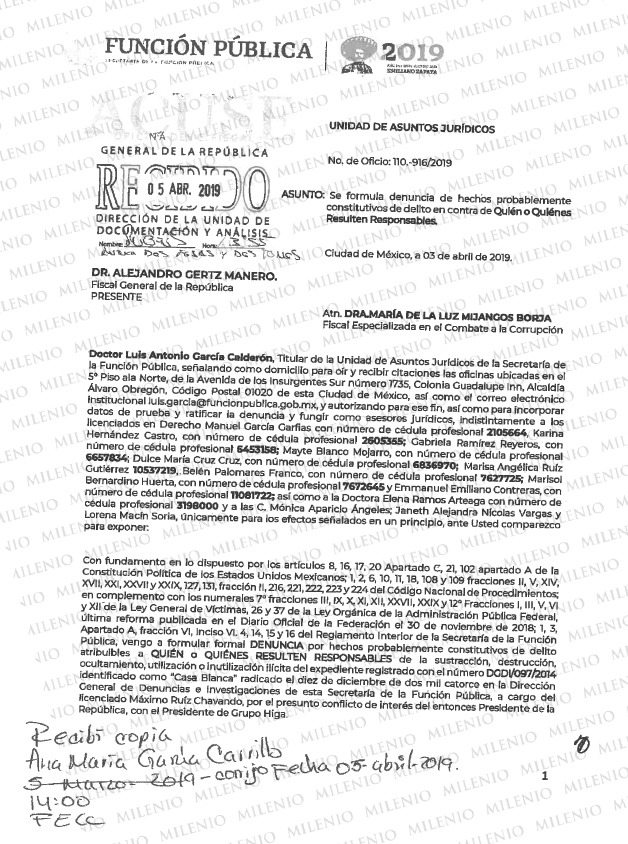 A través de solicitudes de acceso a la información, la SFP respondió a MILENIO que, a dos años, el expediente QD/1255/2018 se encuentra en trámite y que la autoridad investigadora aún no resuelve la investigación de la sustracción del expediente de la Casa Blanca de Peña Nieto.