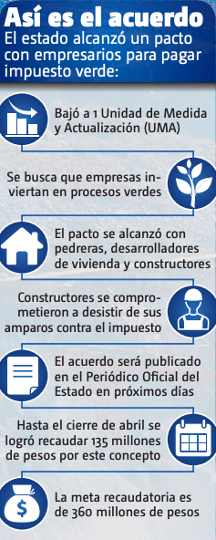 “El proyecto del acuerdo, el cual se está afinando en los últimos detalles, contempla otorgar una facilidad administrativa a los sujetos del impuesto, en este caso las pedreras, para que se pueda reducir la cuota del impuesto verde de 1.5 UMAs a 1 UMA, esto con el objetivo de llegar hasta una cantidad que puede ser menor a la UMA, y así los empresarios puedan seguir con las inversiones en sus procesos productivos verdes”, explicó el subsecretario.