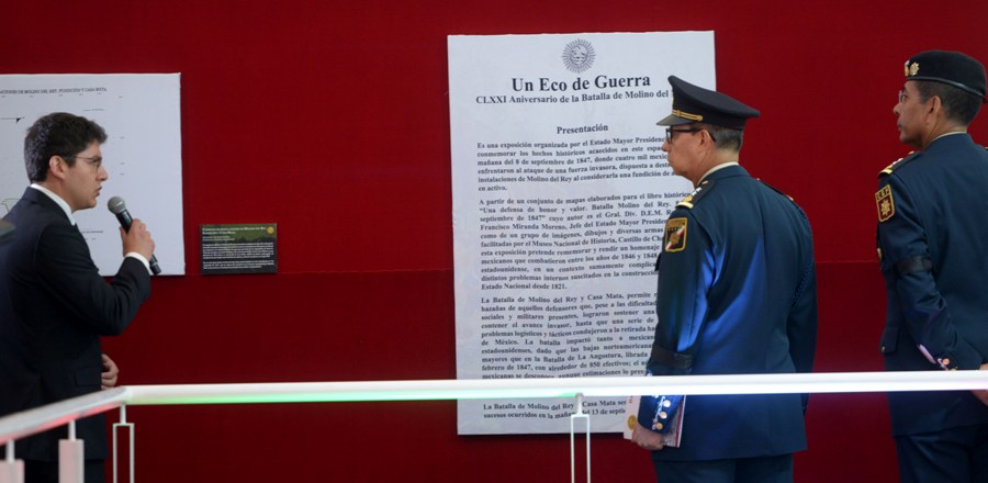 Posteriormente, realizó un recorrido por la “Exposición: Un Eco de Guerra, 171 Aniversario de la Batalla del Molino del Rey”, cuyo objetivo es rememorar y rendir un homenaje a los mexicanos que defendieron al país ante la invasión estadunidense de 1846 a 1848.