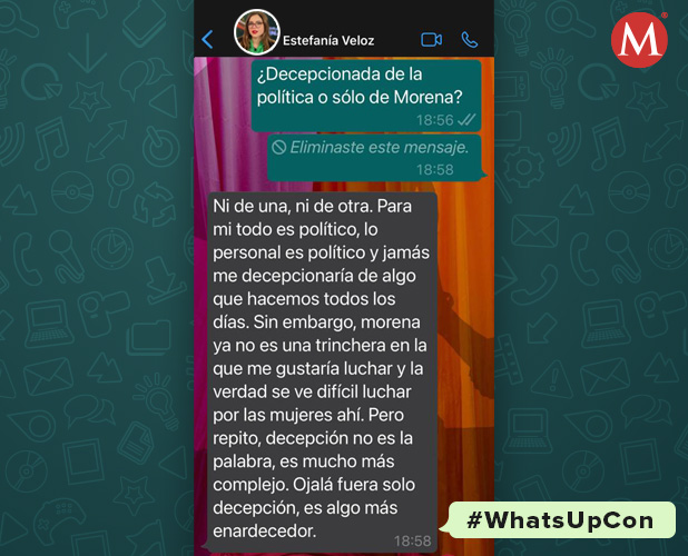 Ni de una, ni de otra. Para mí todo es político, lo personal es político y jamás me decepcionaría de algo que hacemos todos los días. Sin embargo, Morena ya no es una trinchera en la que me gustaría luchar y la verdad se ve difícil luchar por las mujeres ahí. Pero repito, decepción no es la palabra, es mucho más complejo. Ojalá fuera solo decepción, es algo más enardecedor.