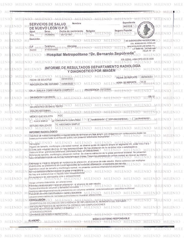 "Estómago e intestino delgado sin evidencia de alteración al alcance de este estudio; marco colónico con múltiples divertículos de predominio en colon sigmoides sin datos de inflamación al momento del estudio; apéndice cecal de tamaño y morfología normal, no presenta cambios inflamatorios adyacentes; no hay cambios inflamatorios en la grasa masenterica; no hay aire extraluminal ni líquido libre intraabdominal; sin evidencia de adenopatía intra o retroperitoneal", refieren algunos de los resultados.