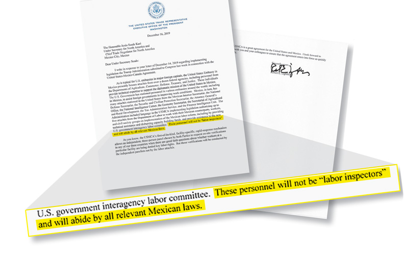 “La administración incluyó el lenguaje en la propuesta del T-MEC que autoriza hasta cinco agregados del Departamento del Trabajo para colaborar con sus contrapartes mexicanas, trabajadores y grupos de la sociedad civil en la implementación de la reforma laboral”, detalla la misiva dirigida al subsecretario.