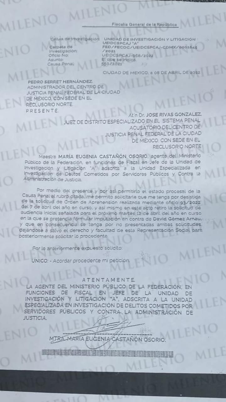 También pidió desistirse de la audiencia inicial programada para mañana contra el asesor financiero David 'N', quien también es señalado por la FGR de probablemente estar involucrado en este caso.