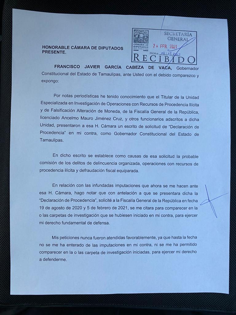 García Cabeza de Vaca entregó hoy a la Secretaría General en el Palacio de San Lázaro un documento de dos páginas, en el que califica de infundadas las imputaciones por delincuencia organizada, operaciones con recursos de procedencia ilícita y defraudación fiscal equiparada que le hace la Unidad Especializada en Investigación de Operaciones con Recursos de Procedencia Ilícita.
