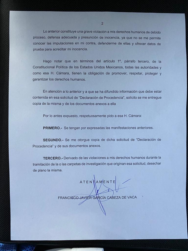 Cabeza de Vaca precisó que, antes de la presentación de la solicitud de desafuero, él mismo solicitó a la FGR comparecer en las carpetas de investigación abiertas en su contra, pero su petición nunca fue atendida y hasta hoy no ha sido enterado de las imputaciones.
