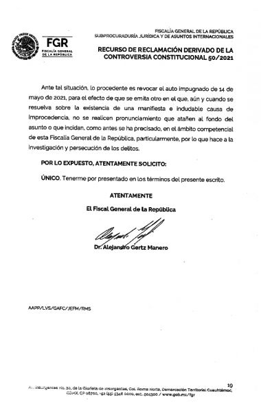 “Ante tal situación, lo procedente es revocar el auto impugnado de 14 de mayo de 2021 para el efecto de que se emita otro en el que, aun y cuando se resuelva sobre la existencia de una manifiesta e indudable causa de improcedencia, no se realicen pronunciamientos que atañen al fondo del asunto o que incidan, como antes se ha precisado, en el ámbito competencial de esta Fiscalía General de la República, particularmente por lo que hace a la investigación y persecución de los delitos”, pide el fiscal.