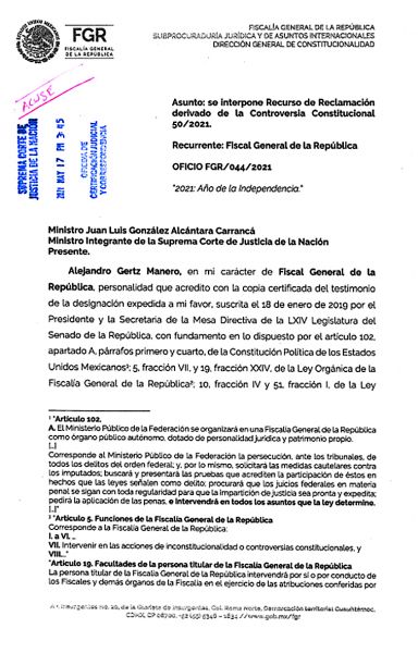 El escrito firmado por Gertz acusa que este desechamiento “trae consigo una intromisión en el ámbito competencial del Ministerio Público de la Federación a quien corresponde investigar y perseguir los delitos federales”.