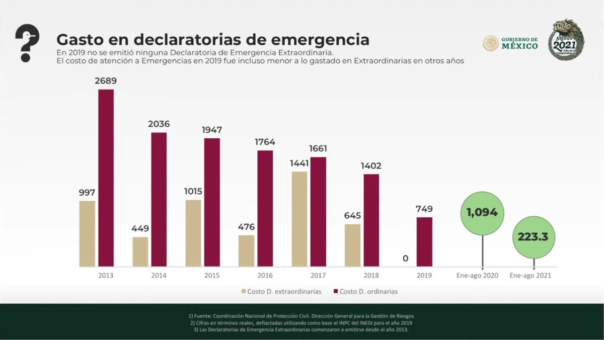 Asimismo, la funcionaria expuso un par de gráficas con las declaratorias de 2007 a 2021 para mostrar el número de declaratorias de emergencia y desastres, así como el gasto realizó en esos casos.